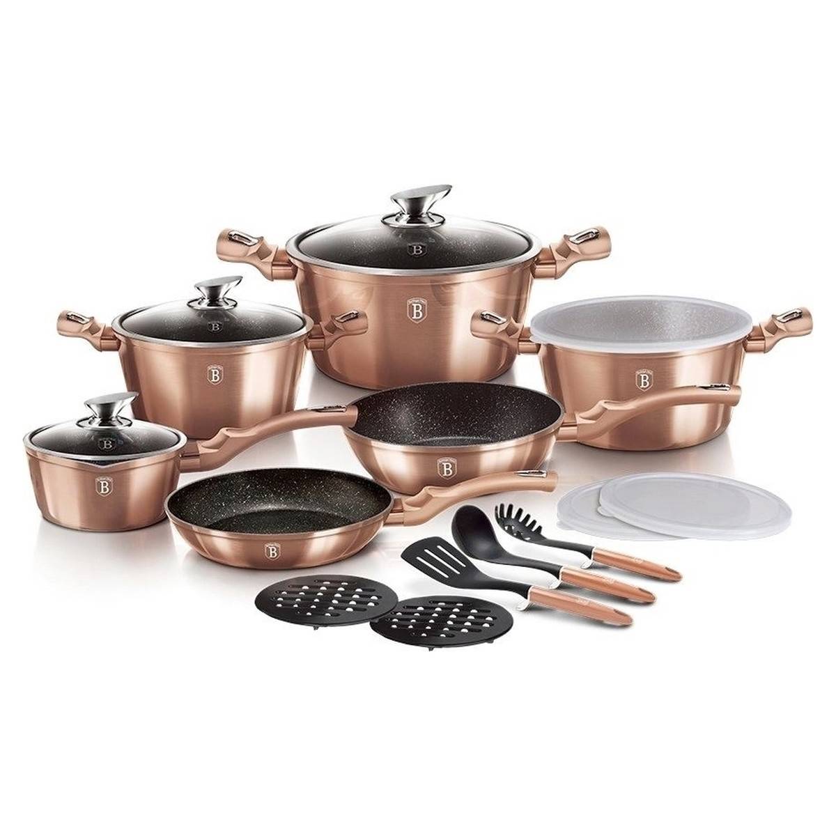 Bohatě vybavená sada nádobí z metalické rosegold kolekce zaujme nejen nepřehlédnutelným moderním designem, ale především svými jedinečnými vlastnostmi. V sadě jsou navíc 3 praktická víčka, kterými lze nádoby uzavřít.