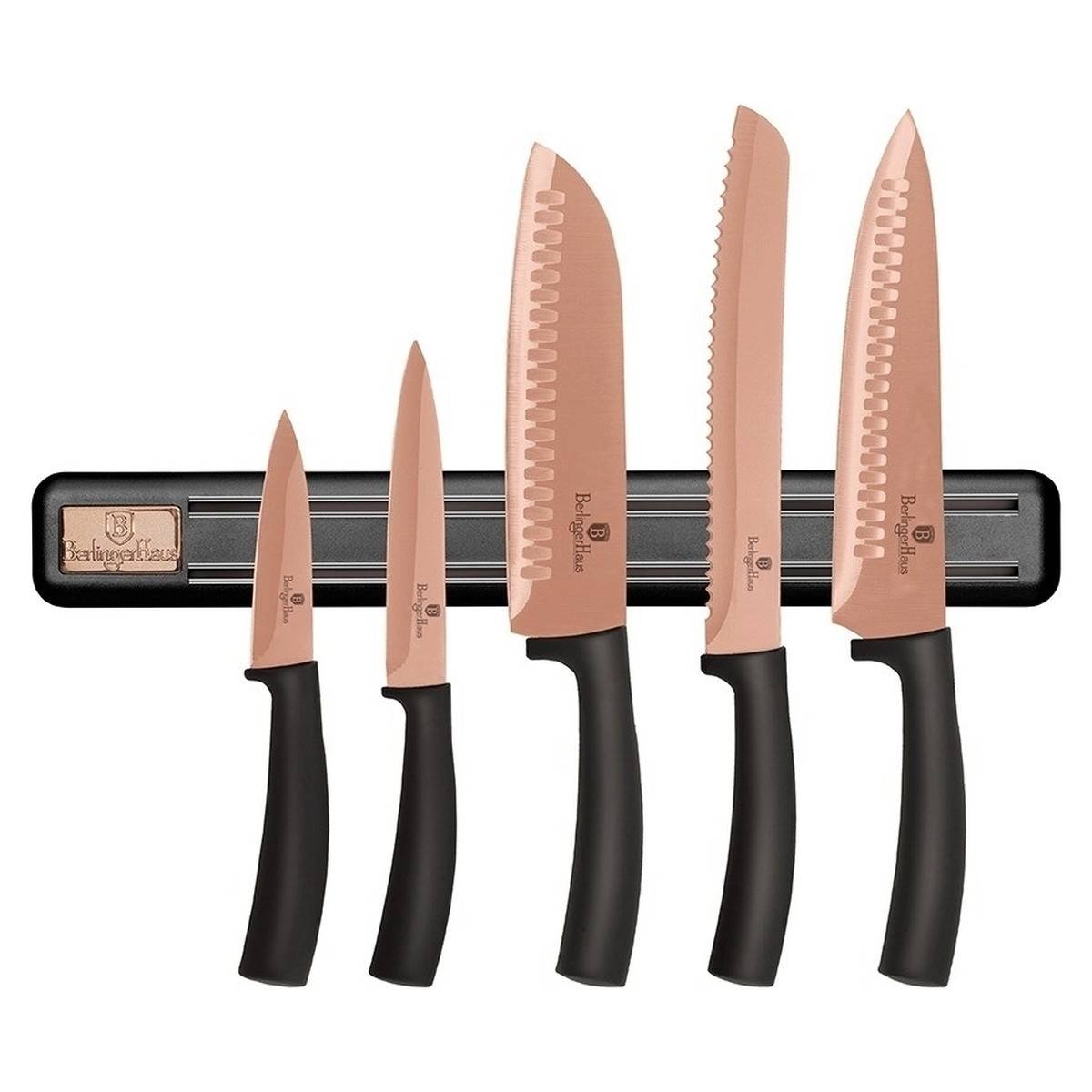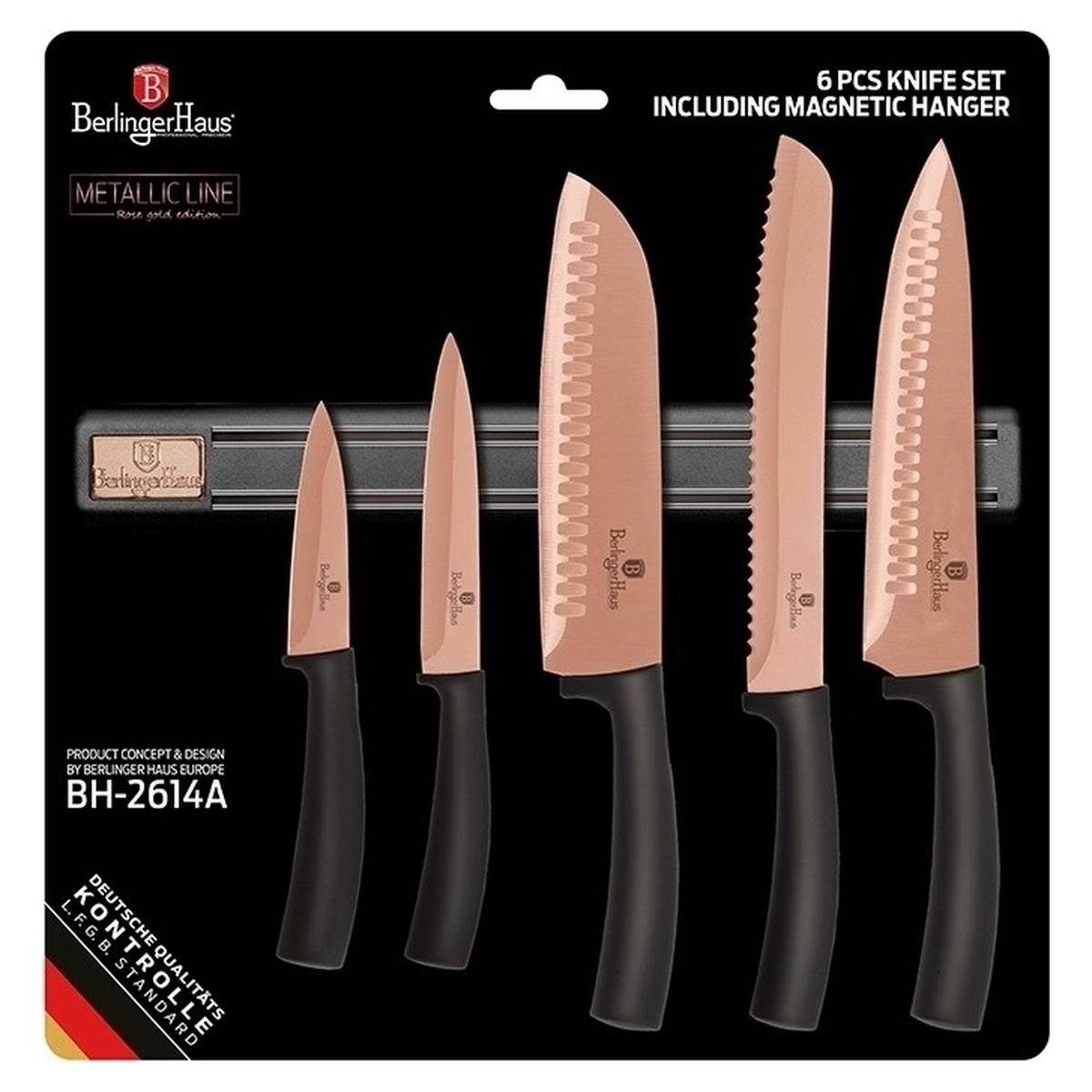 Sada nejpoužívanějších kuchyňských nožů z černozlaté kolekce Black Rose. Navíc s praktickým magnetickým držákem na stěnu či zeď, na kterém budou nože vždy přehledně uskladněny. Čepele jsou z nerezové oceli, potažené antibakteriálním povrchem Diamond. Tento povrch je nepřilnavý, takže se připravované potraviny na nože nelepí, navíc funguje jako ochrana čepelí. Také nepřenáší pachy krájených potravin, neničí vitamíny v nich a nezůstávají na něm skvrny. To je výhodné především při krájení různých druhů potravin, nože mezitím stačí jen opláchnout ve vodě. Rukojeti se speciální úpravou SoftTouch jsou měkčené a tím zajistí spolehlivý, pevný úchop. Navíc jsou ergonomicky tvarované a protiskluzové, takže nekloužou i když máte třeba mokrou ruku. Nepřilnavé nože lze brousit standartně ocílkou, brouskem nebo na brusném kameni, stejně jako jste zvyklí u klasických nožů.
