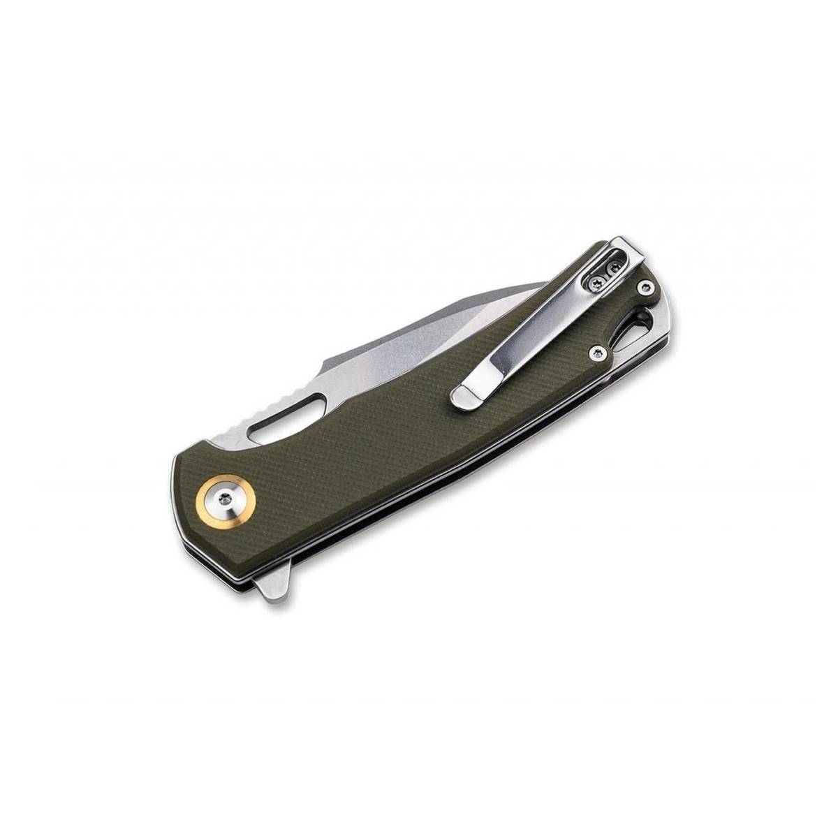 - Zelené střenky rukojeti z materiálu G10 jsou texturované, připomínají plazí kůži a poskytují pevný úchop.