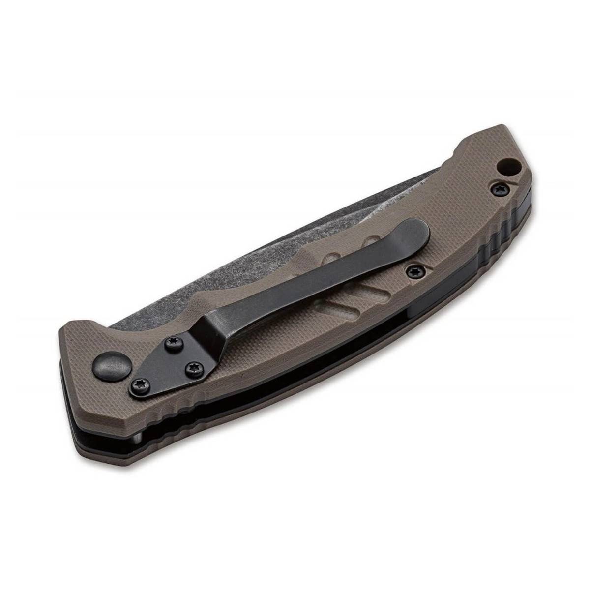 - Ergonomicky tvarovaná rukojeť je vyrobena z texturovaného materiálu G10 pro pevný úchop.