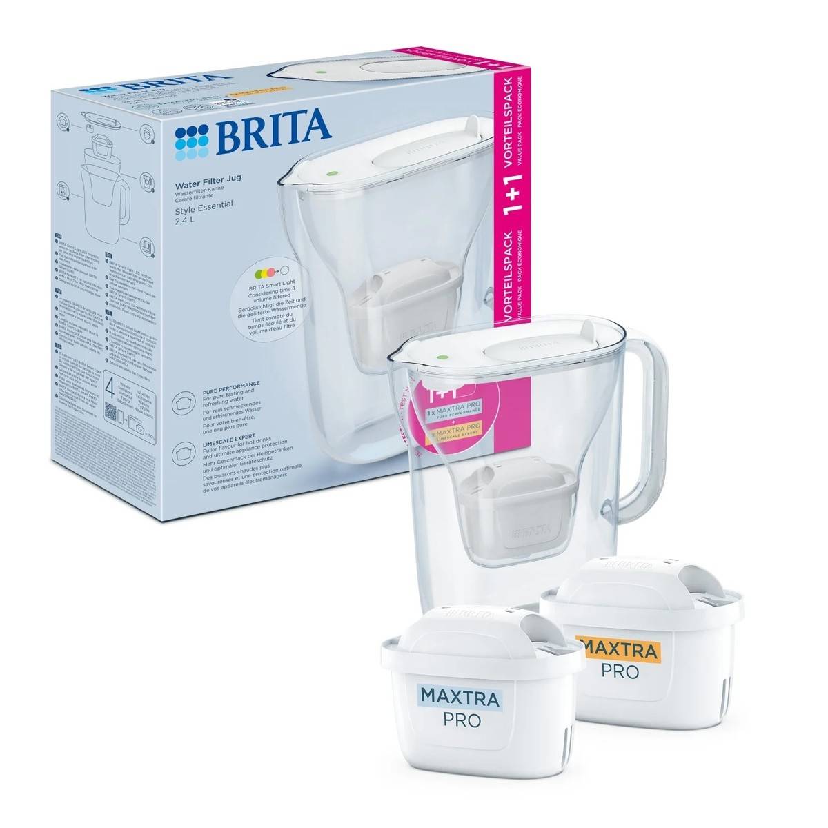 - Bílá filtrační konvice BRITA Style Essential s celkovým objemem 2,4 litru.
