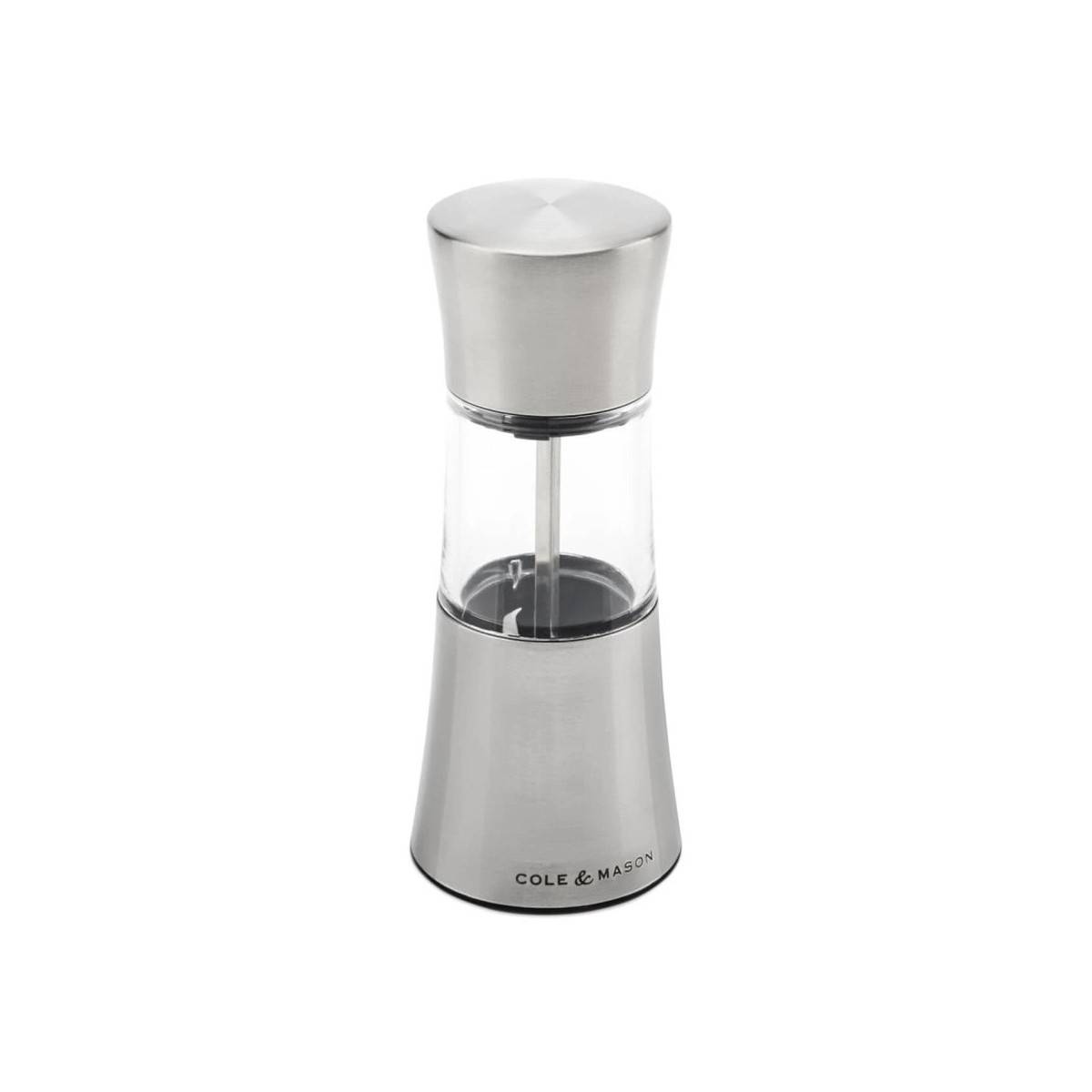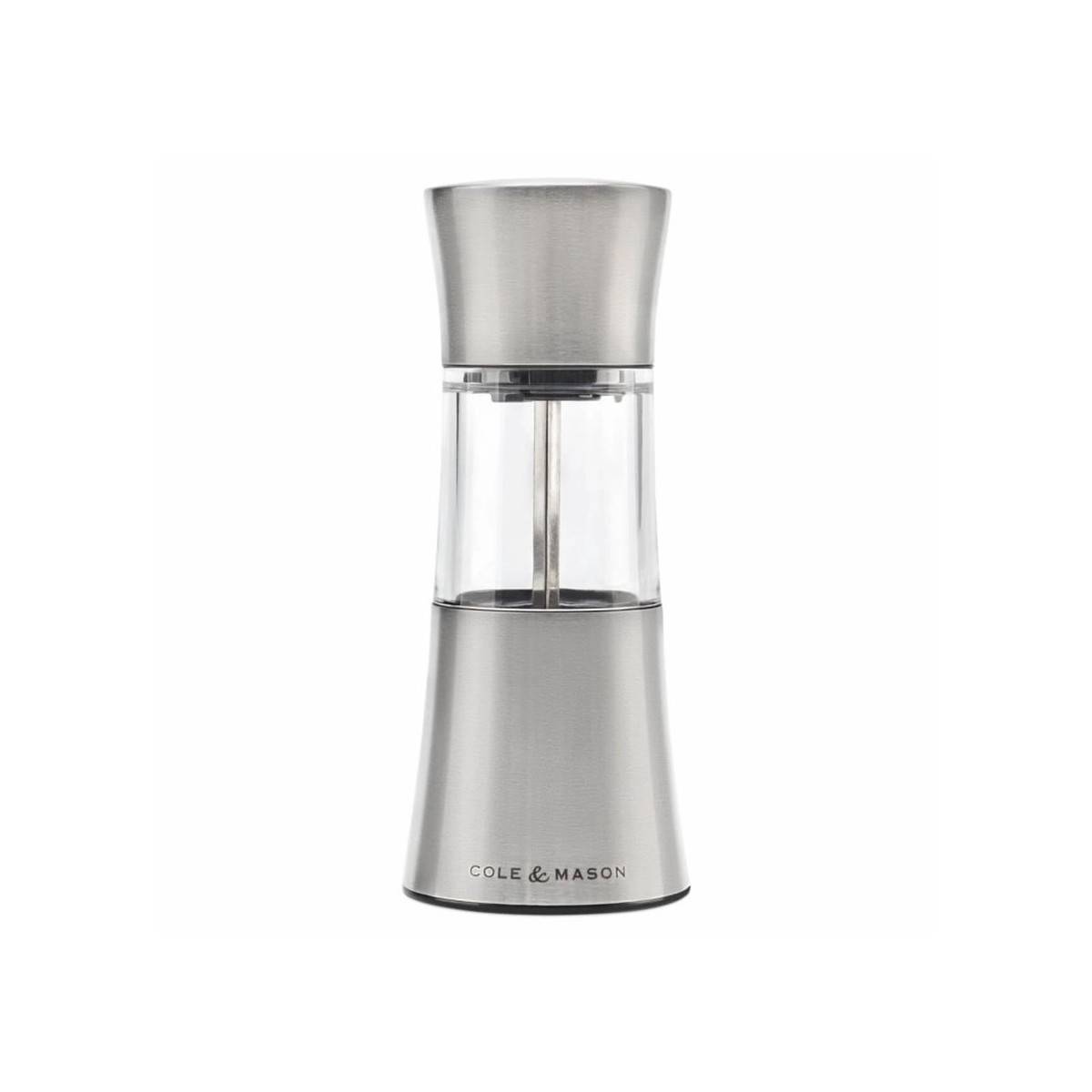 - Nadčasový design kombinuje průhledný akryl s broušenou nerezovou ocelí a nese logo Cole & Mason.