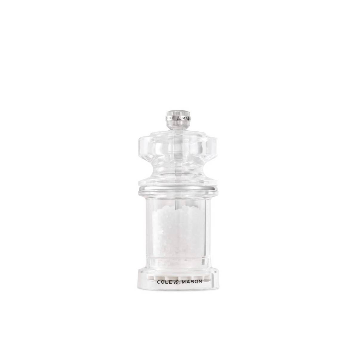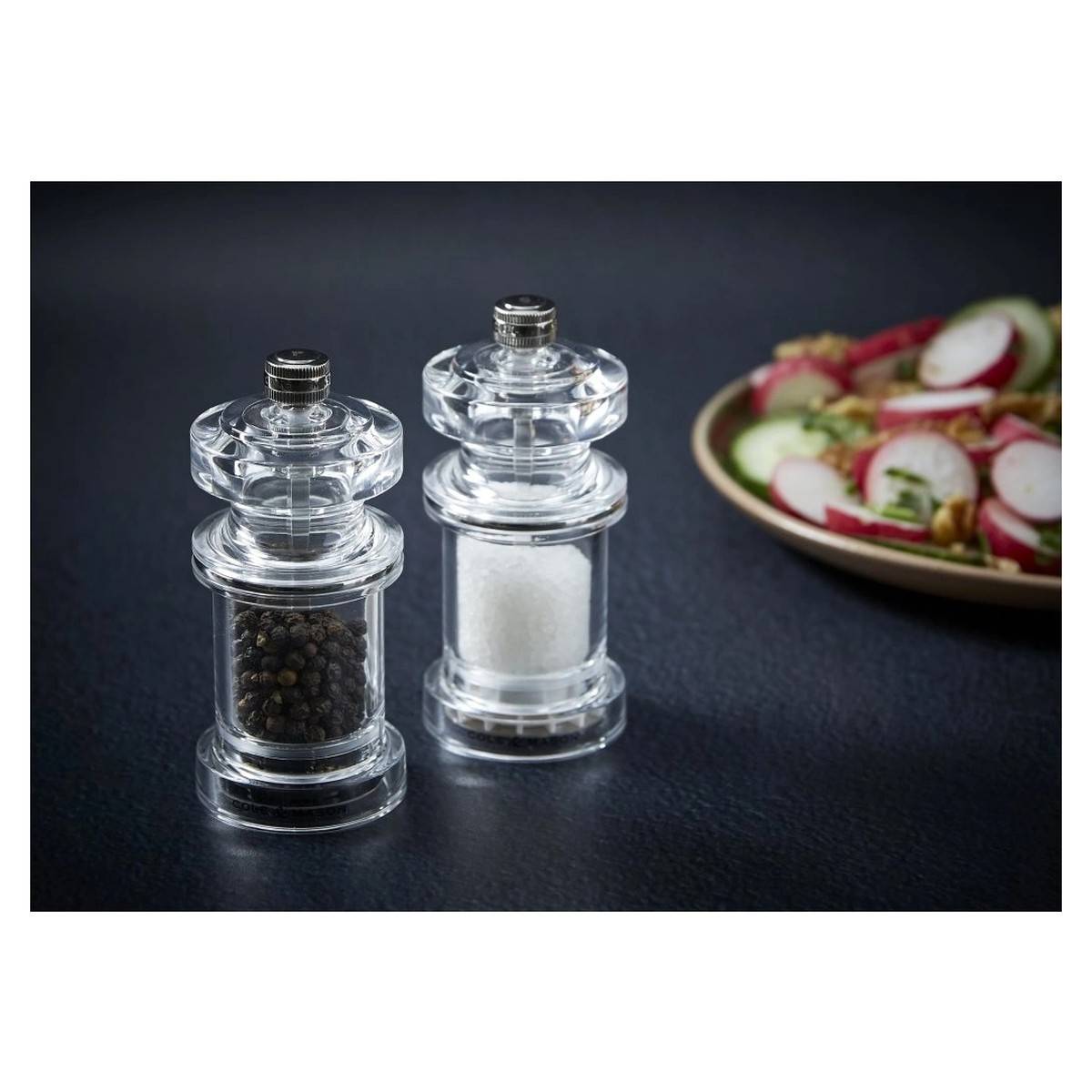 - Mlýnek na sůl s nadčasovým designem, který kombinuje odolný, transparentní akryl s oblými hranami.