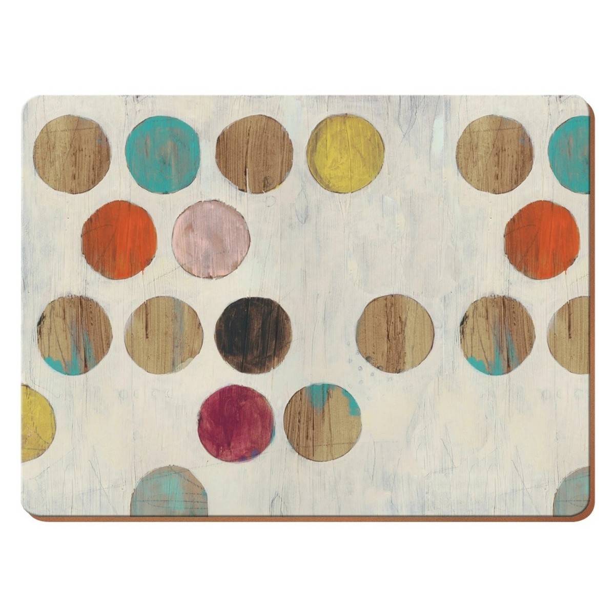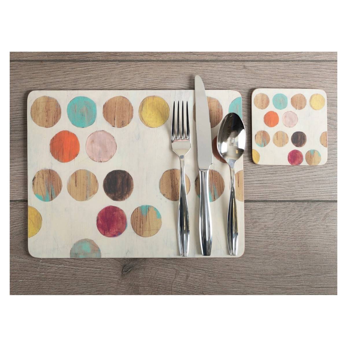 - Hravý retro design kombinuje pestrobarevné puntíky s pozadím v dekoru dřeva.