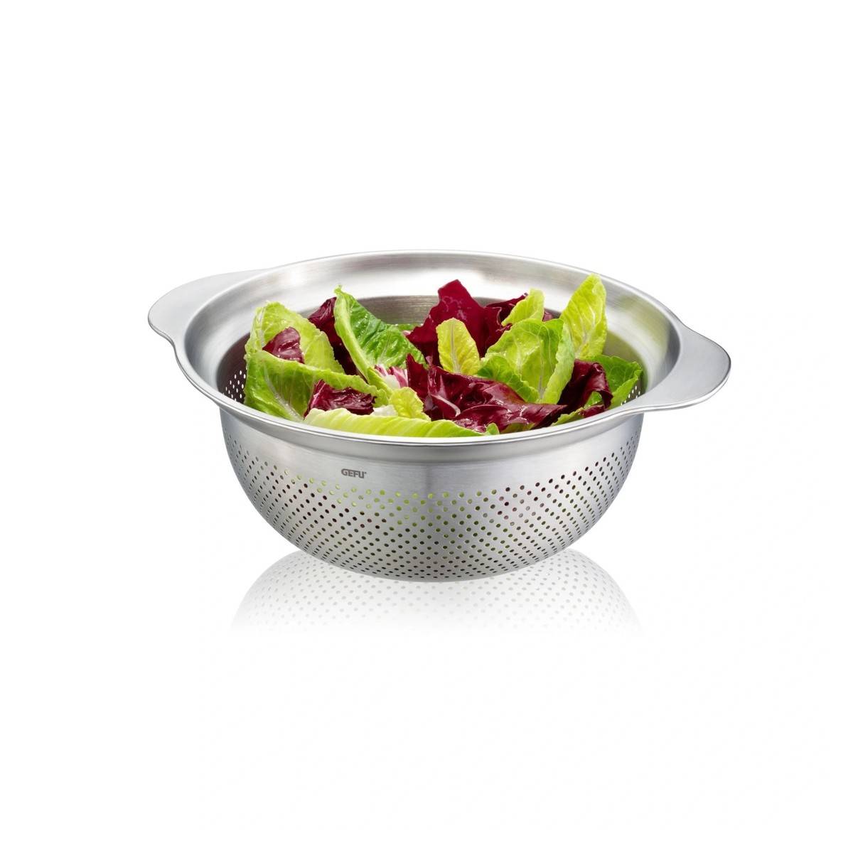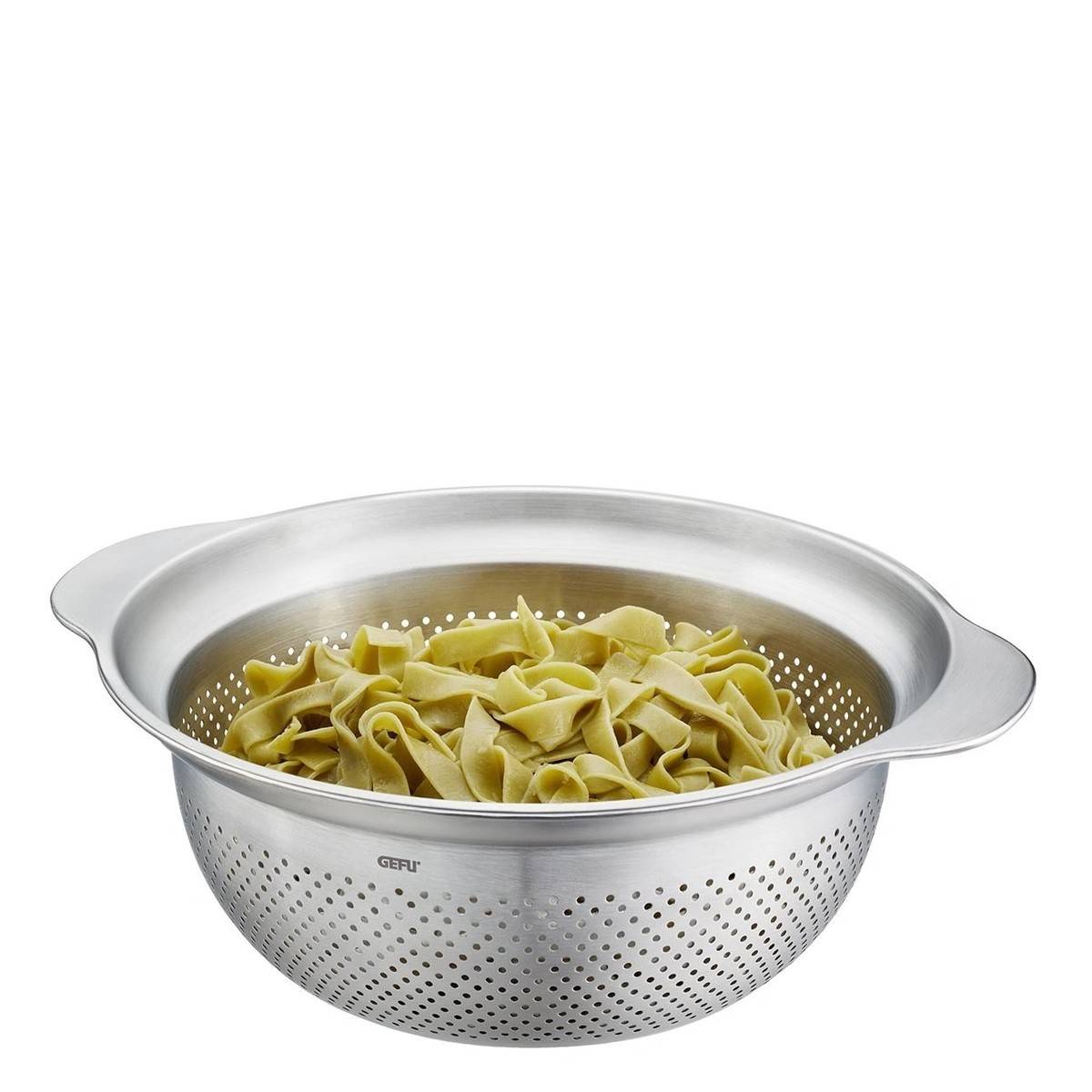 Robustní cedník Premio z nerezové oceli s obzvlášť jemnou perforací je perfektním kuchyňským nástrojem 3 v 1 pro bezpečné scezení, pohodlné mytí i šetrné napařování.