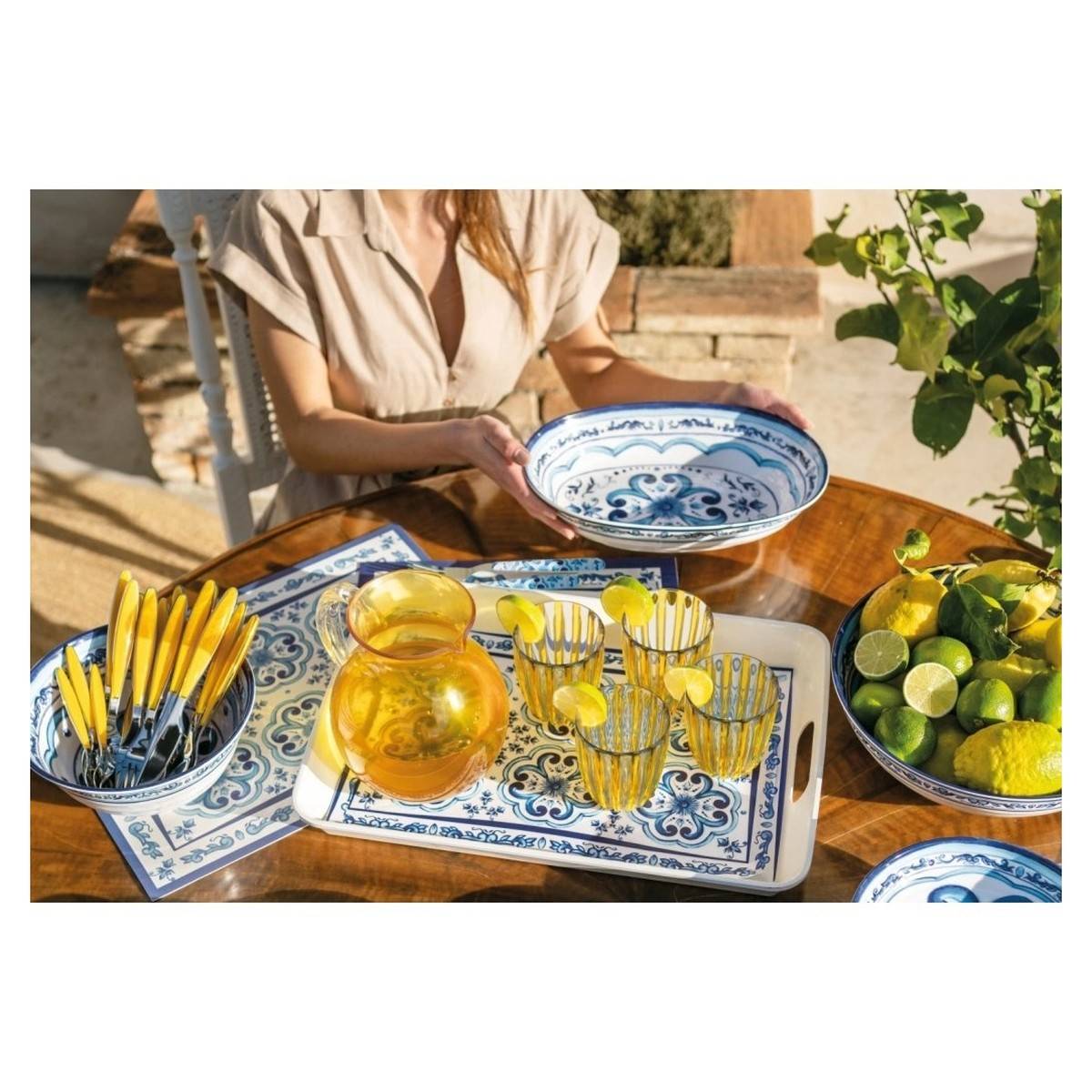 - Jasně modré tóny a zaoblené vzory evokují letní pohodu u bazénu či na lodi.