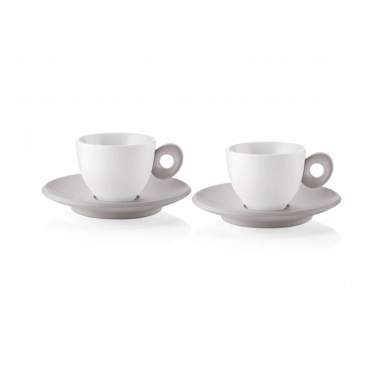 - Souprava dvou šálků s podšálky, ideální pro servírování espressa.