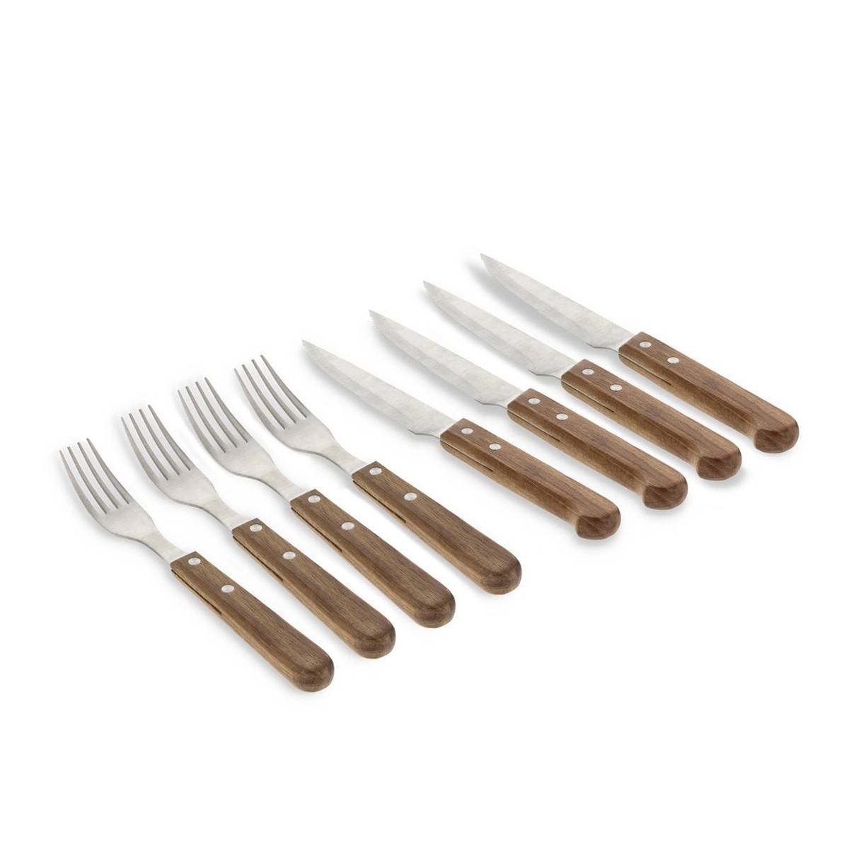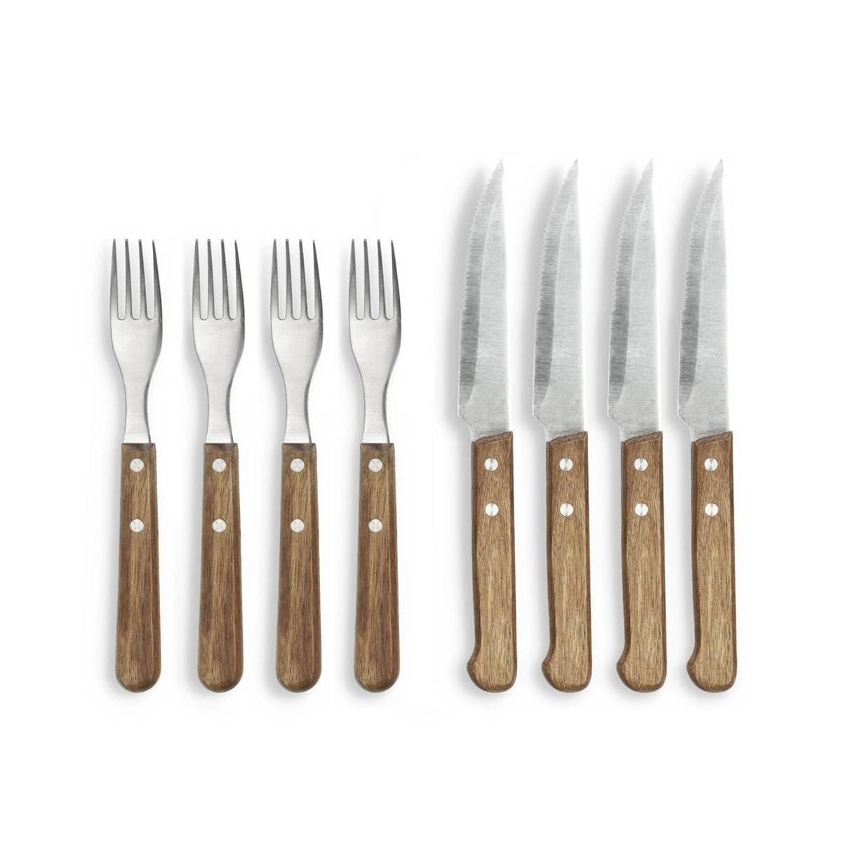 - Rukojeti jsou vyrobeny z masivního akáciového dřeva, které sadě dodává elegantní, přírodní vzhled.