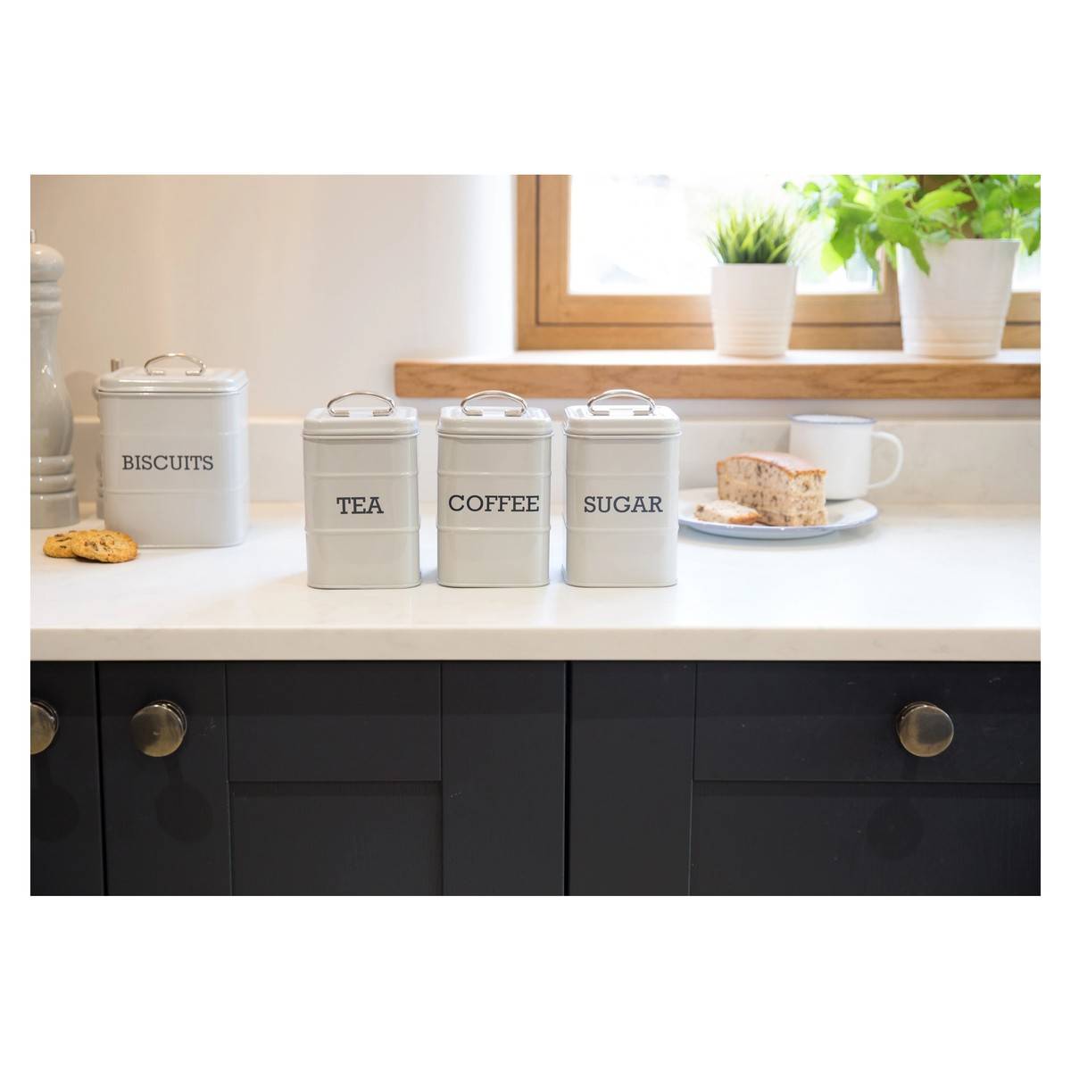 - Ladí s plechovkami na kávu a cukr