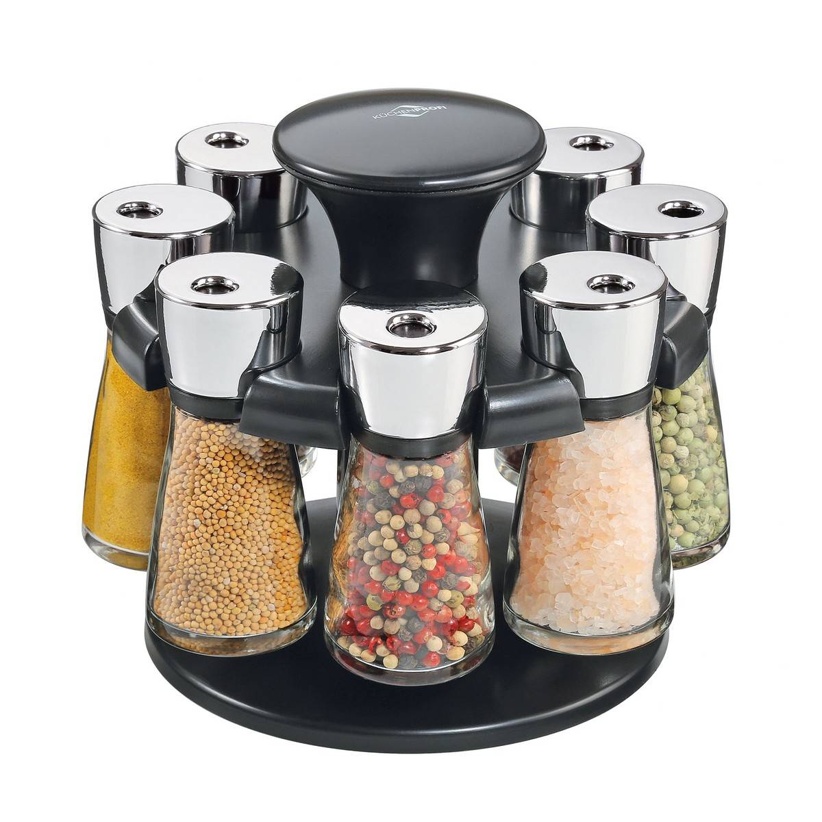 - Otočný stojan obsahuje 8 prázdných skleněných dóz na koření.