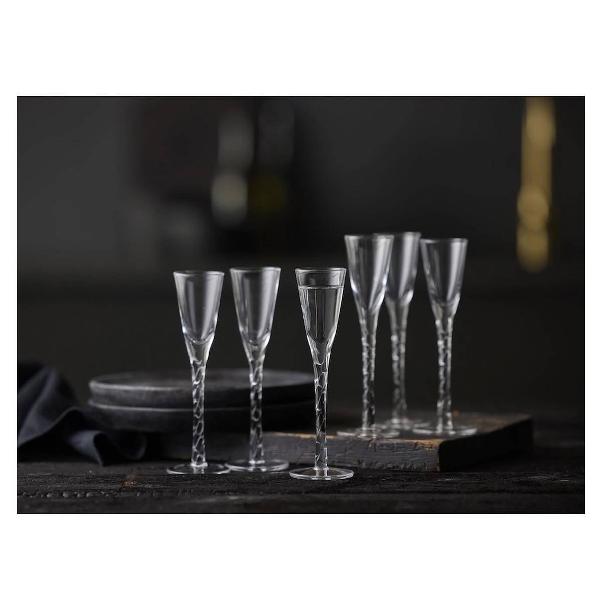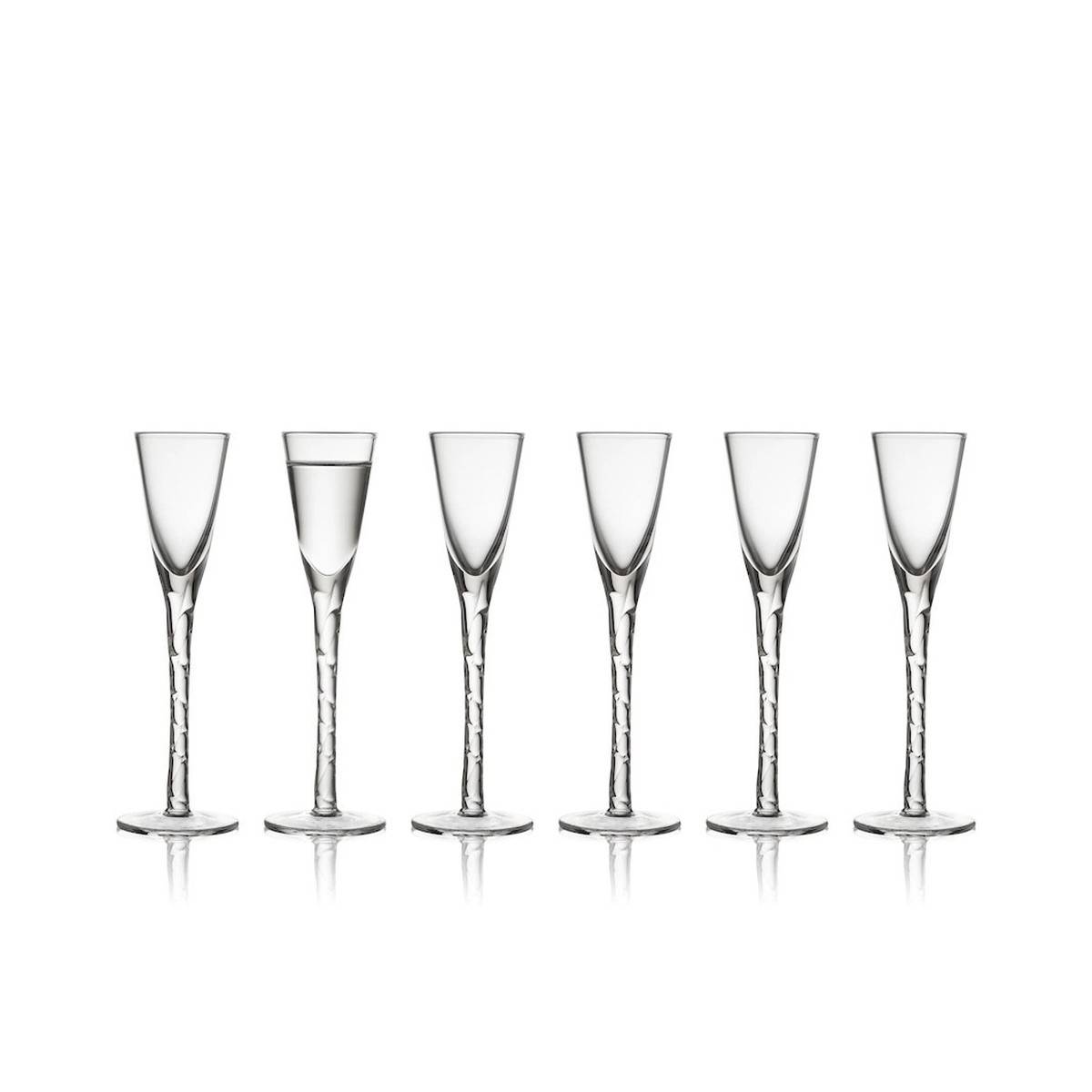 - Šest kusů nádobí z čirého skla určených pro podávání krátkých drinků a destilátů.