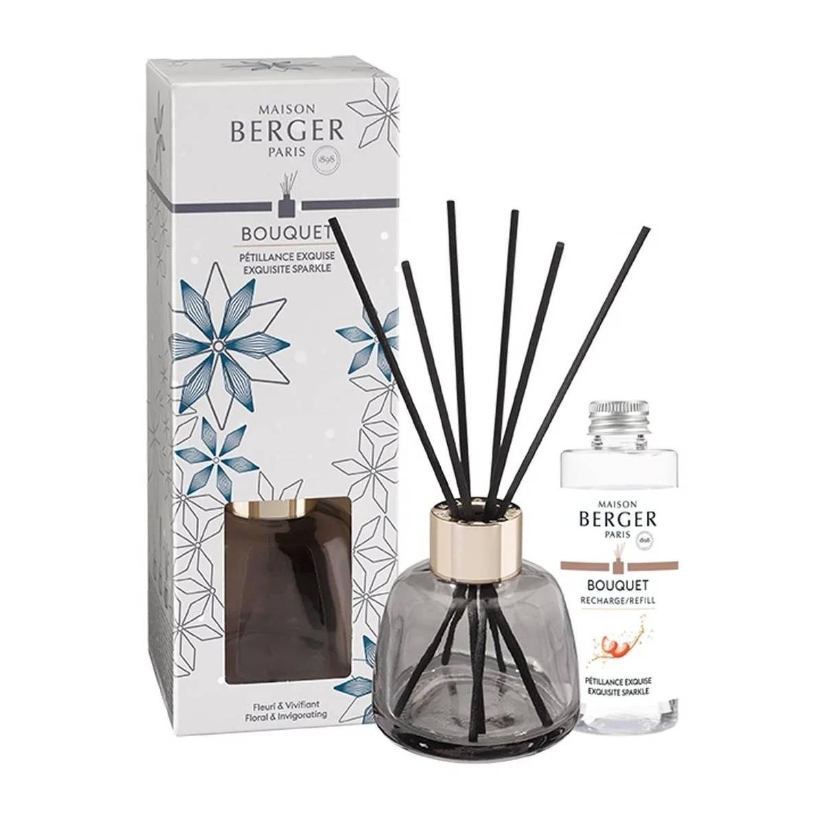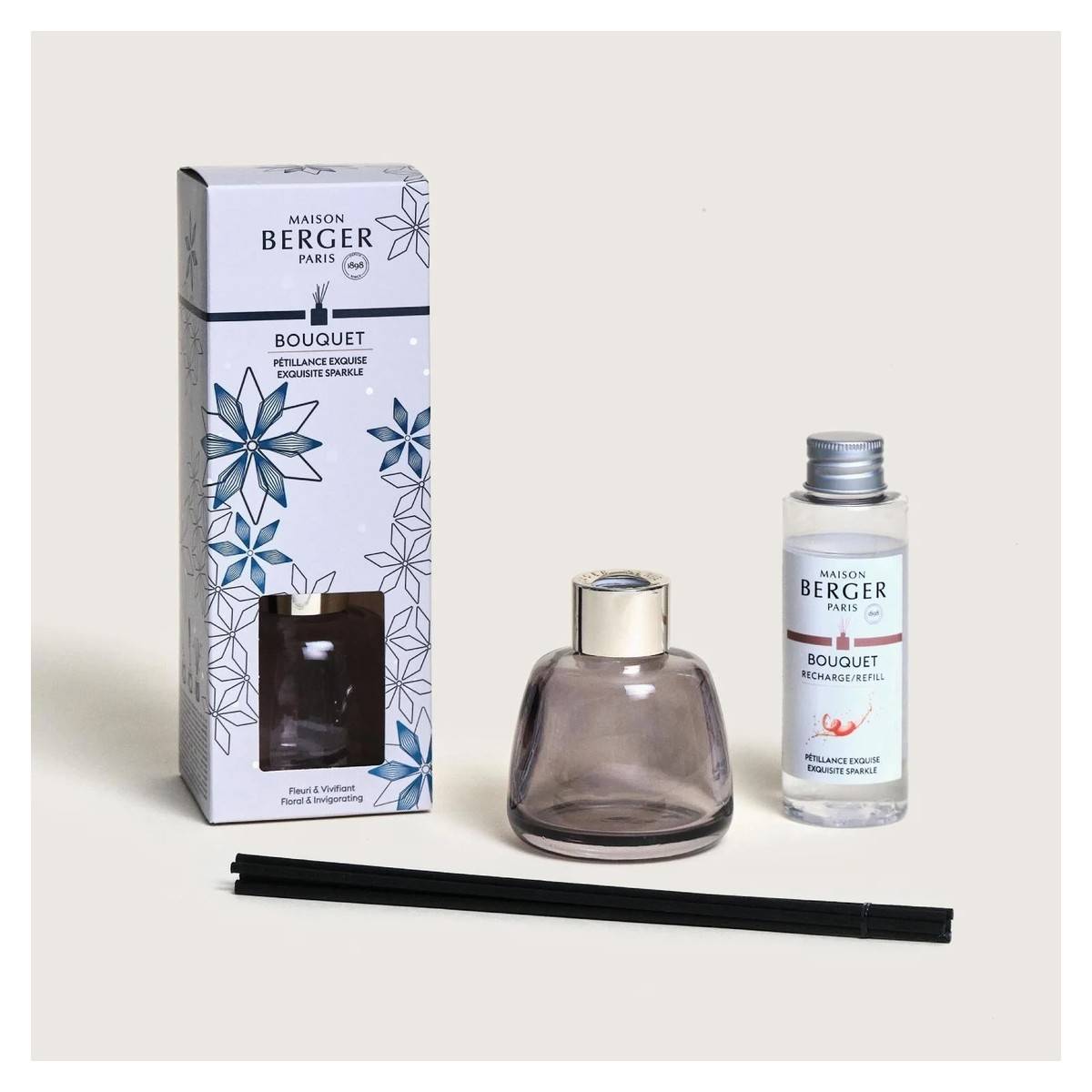 - Elegantní dárková sada obsahující skleněný mini difuzér Rosalie v šedé barvě.
