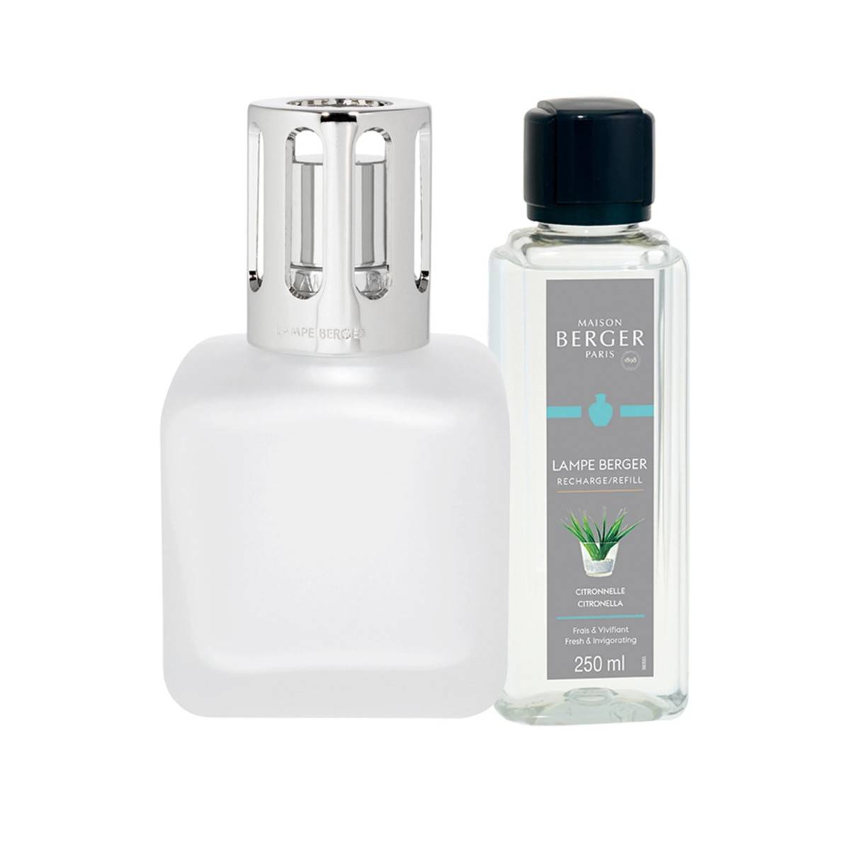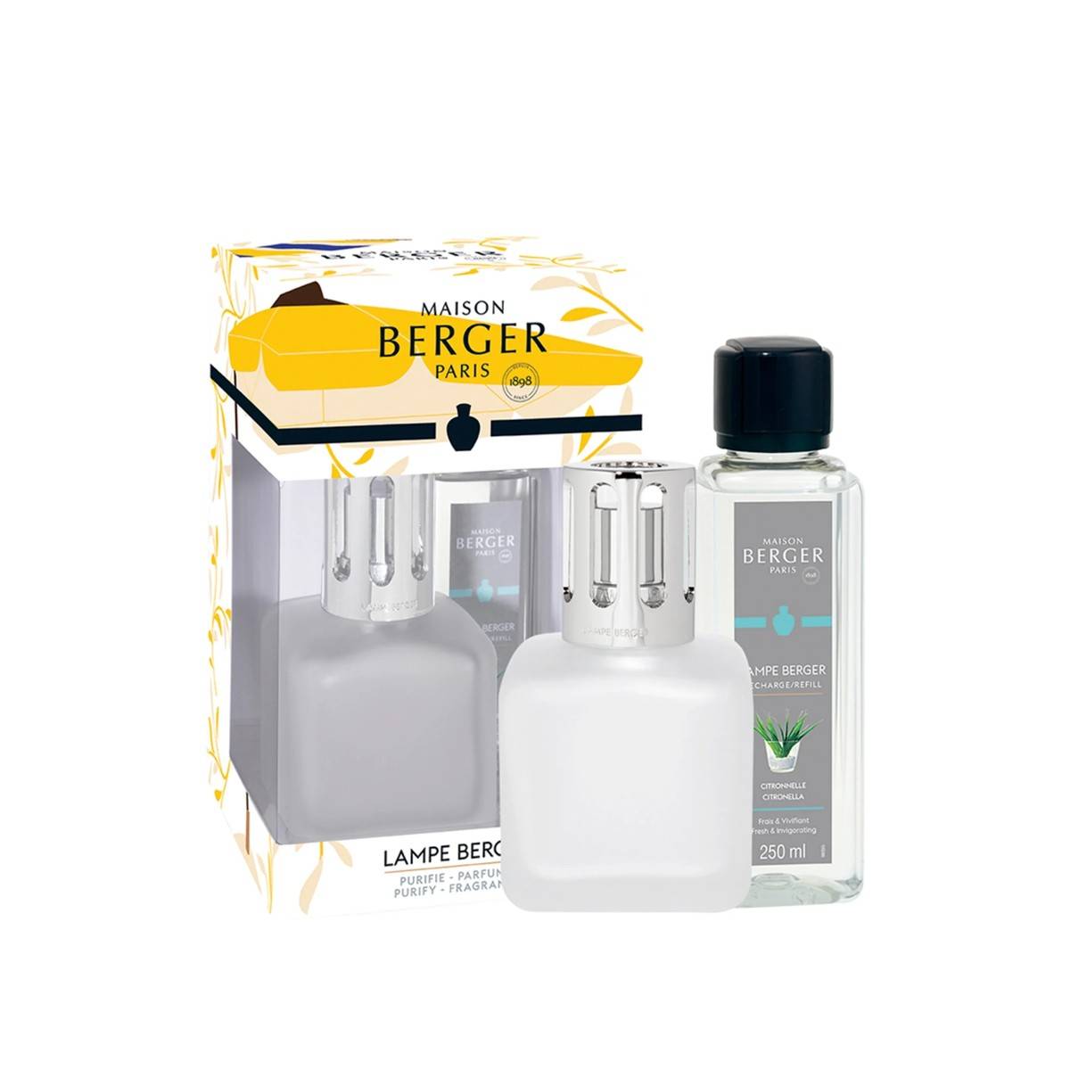 Dárkový set pro pohodlný začátek s lampami a parfémy Maison Berger Paris obsahuje matnou lampu Glacon a interiérový parfém Citronella o objemu 250 ml.