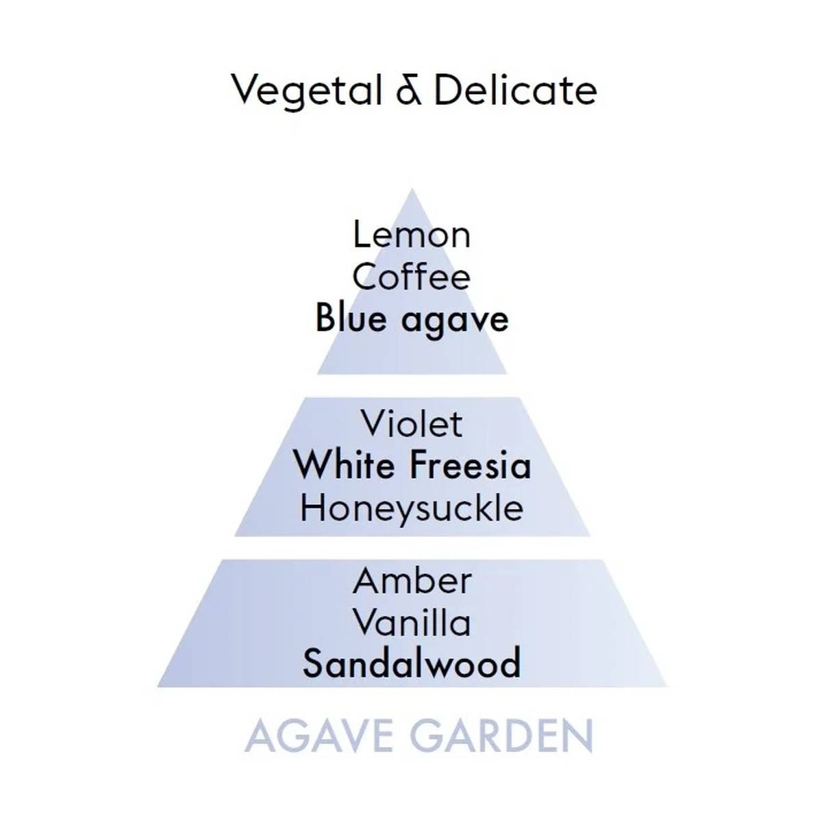 Parfém Agávová zahrada začíná ve vysokých tónech kombinací citronu, modré agáve a kávy. Ve středních tónech pak ucítíte květinový akord: bílá frézie, zimolez a fialka, v základu pak teplejšími tóny ambry a santalového dřeva s vanilkou.