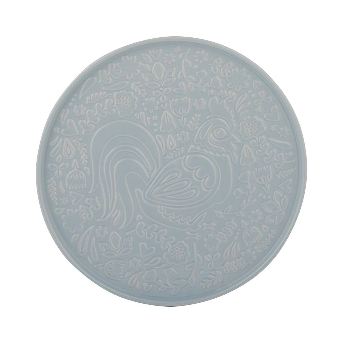 - Kulatý tvar s modrým podkladem je doplněn reliéfním venkovským motivem kohouta.
