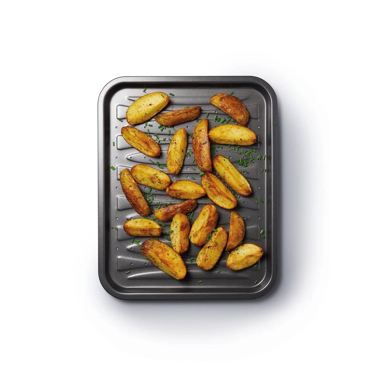 - Spolehlivý nepřilnavý povrch se postará o snadné sundání jídla z plechu.