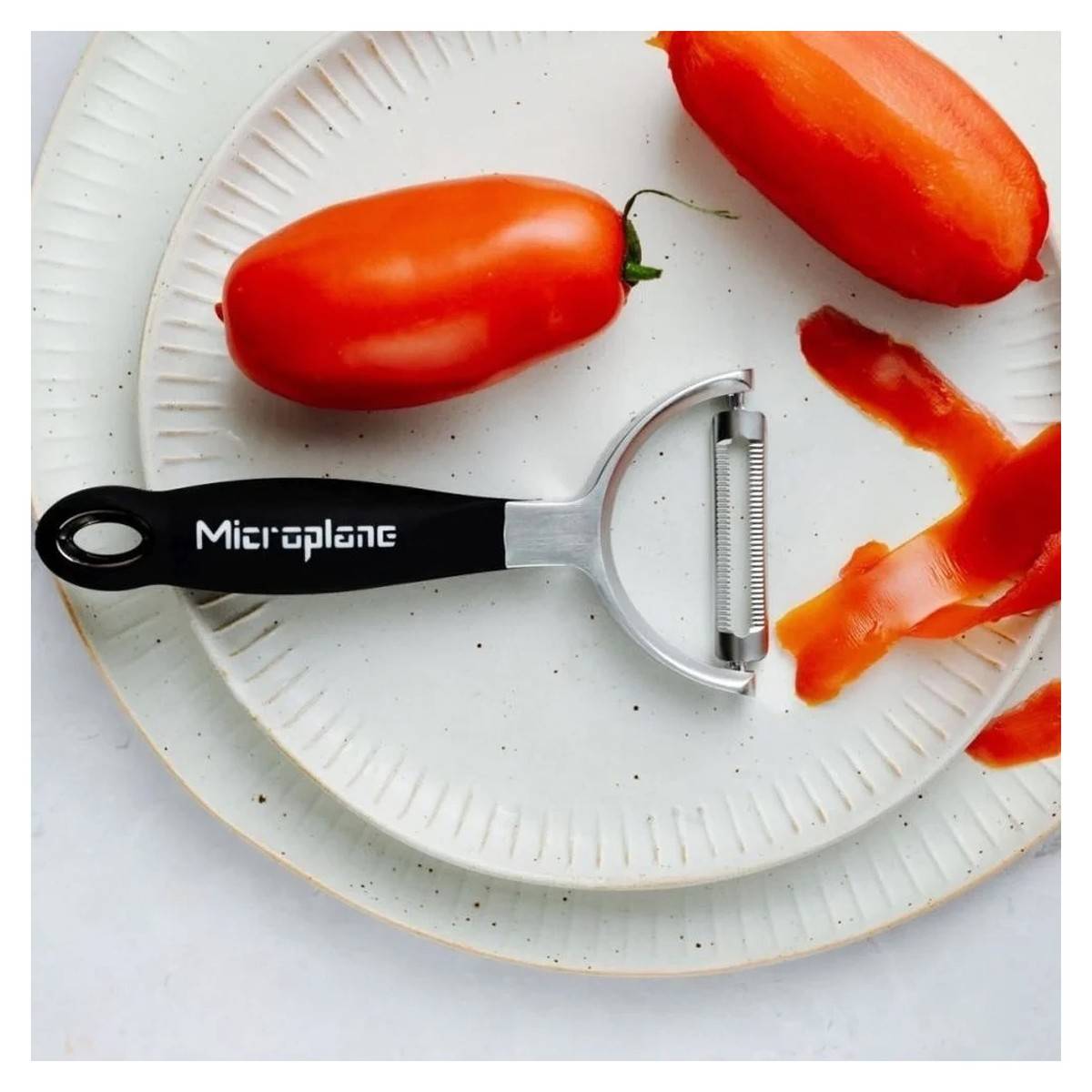 - Profesionální vroubkovaná škrabka Microplane s dvojitou otočnou čepelí.