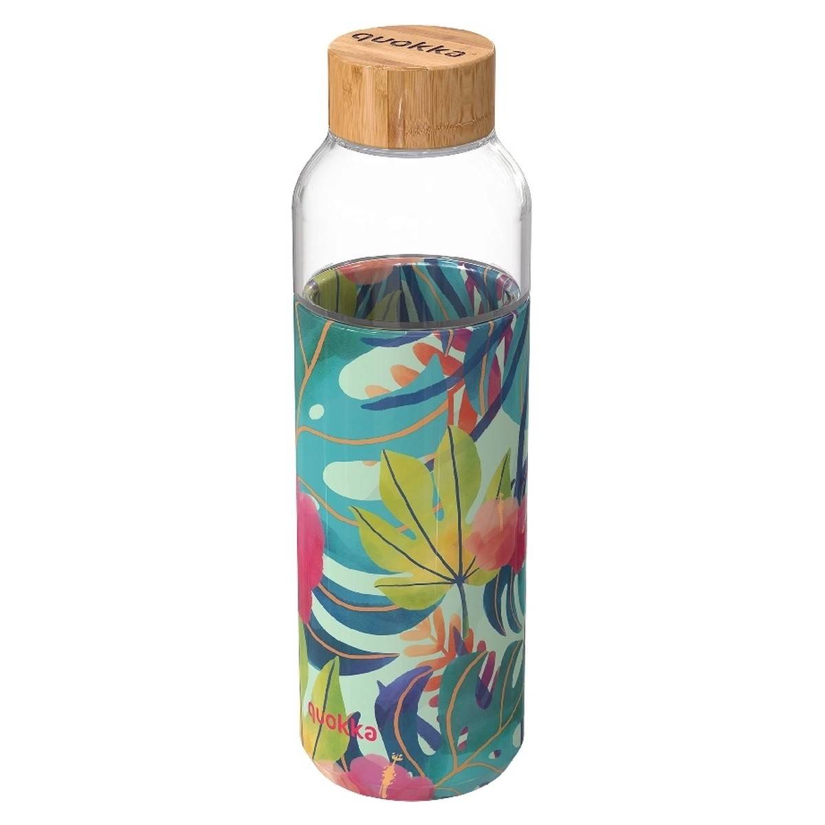 Stylová skleněná láhev na vodu s kulatým tělem a ochranným silikonovým krytem a bambusovým víčkem o objemu 660 ml. Stylová skleněná láhev na vodu s kulatým tělem a ochranným silikonovým krytem a bambusovým víčkem o objemu 660 ml.