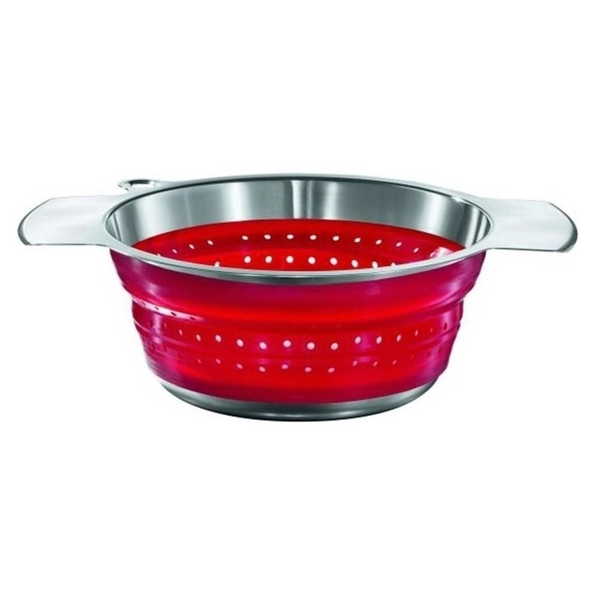 Červený cedník, v kombinaci silikonu a nerezové oceli 18/10, vhodný na zavěšení.