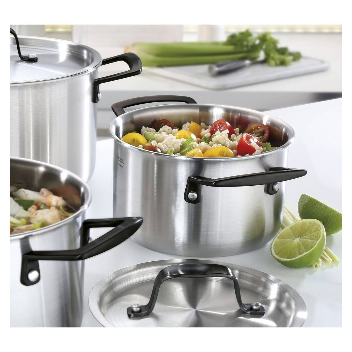 - Pěti-vrstvý materiál: vnější vrstva z nerezové oceli 18/0 vhodné pro indukci, vnitřní vrstva z nerezové oceli 18/10 a trojitý hliníkový jádro