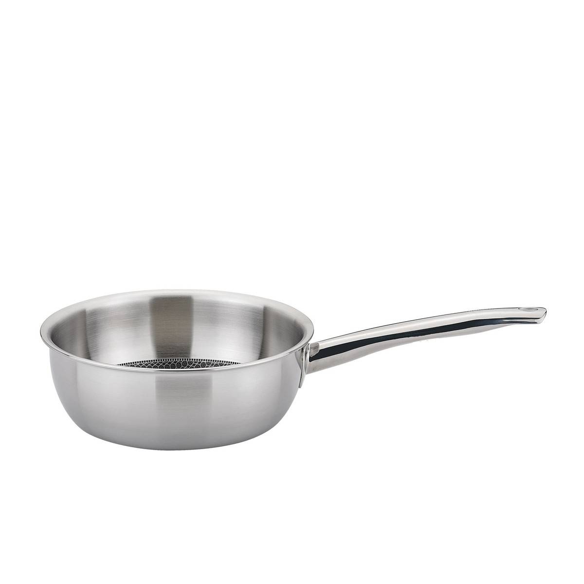 - 5vrstvé provedení: vnější vrstva z nerezové oceli 18/0 vhodné pro indukci, vnitřní vrstva z nerezové oceli 18/10 a třívrstvé hliníkové jádro