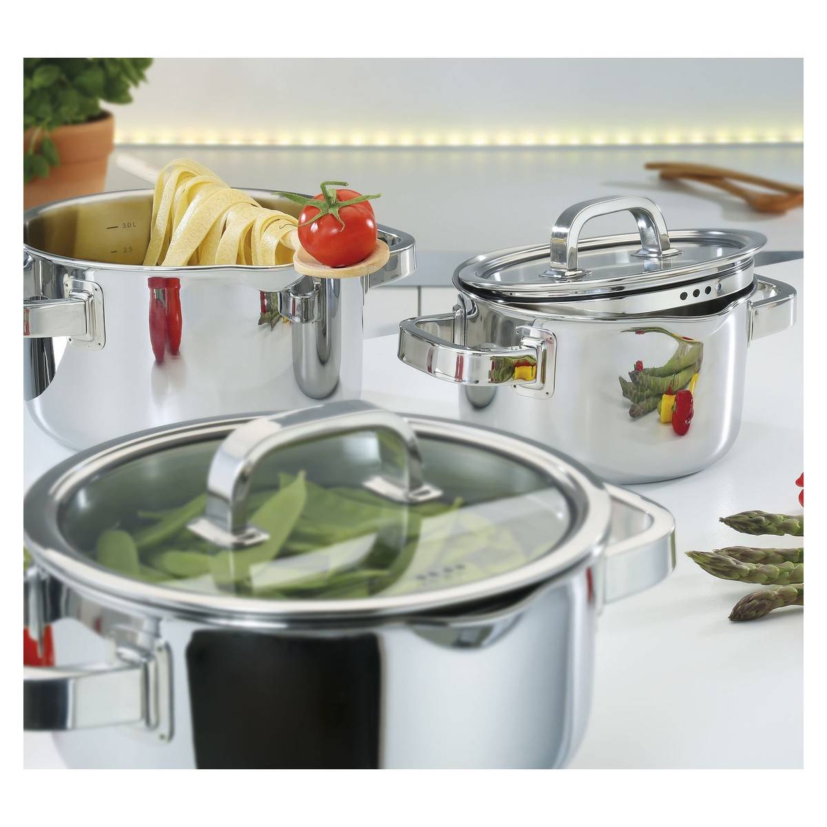 - Praktická vnitřní stupnice v každém hrnci umožňuje přesné a trvalé měření množství přímo při vaření.