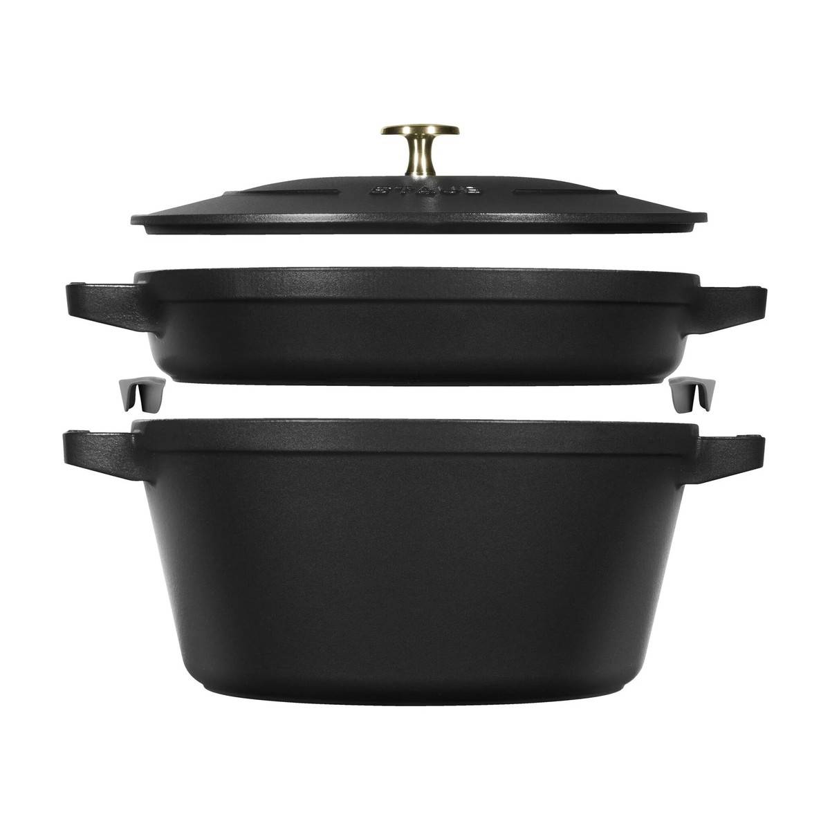 - Kompaktní 2dílná sada kulatého litinového nádobí STAUB v černé barvě.