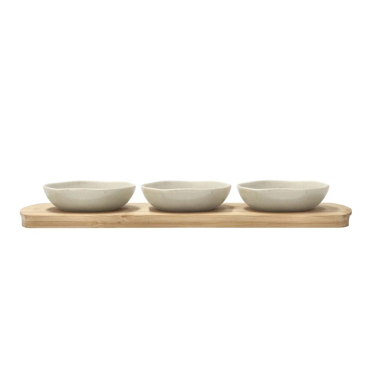 - Materiálová kombinace robustní kameniny a doplňků z přírodního bambusu.