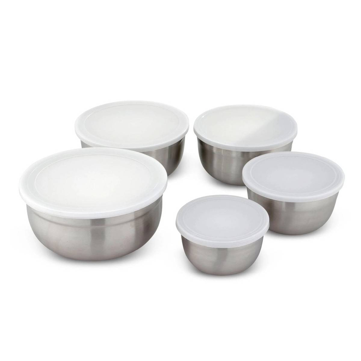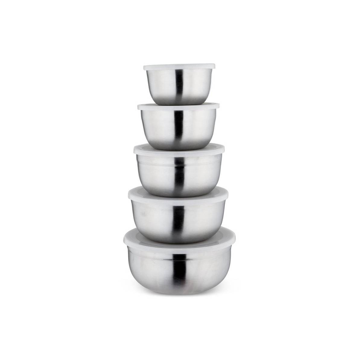 - Pětidílná sada nerezových kuchyňských misek s praktickými víčky.