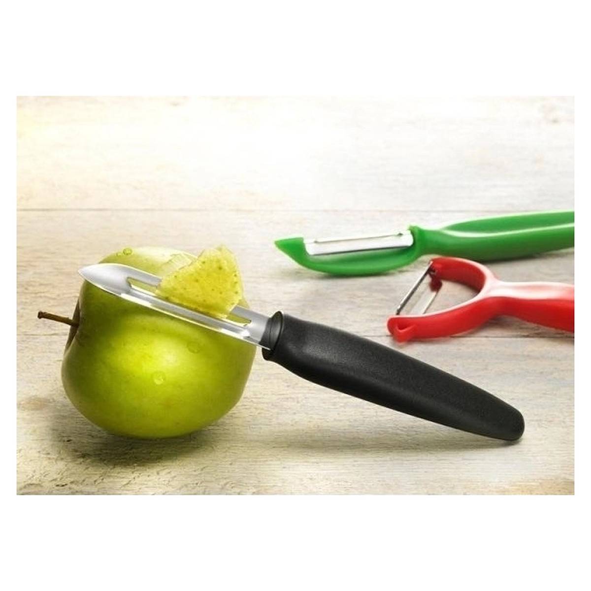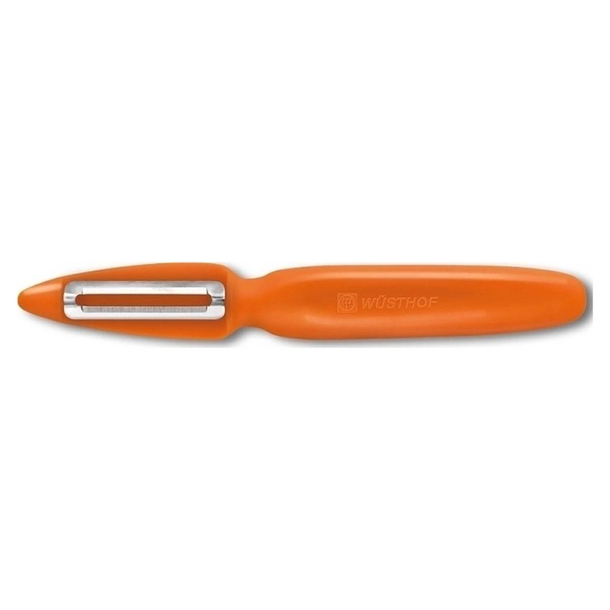 Praktická výkyvná škrabka umožňuje oloupat kulaté, měkké potraviny - Wüsthof Dreizack Solingen.
