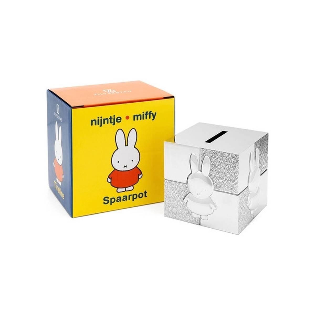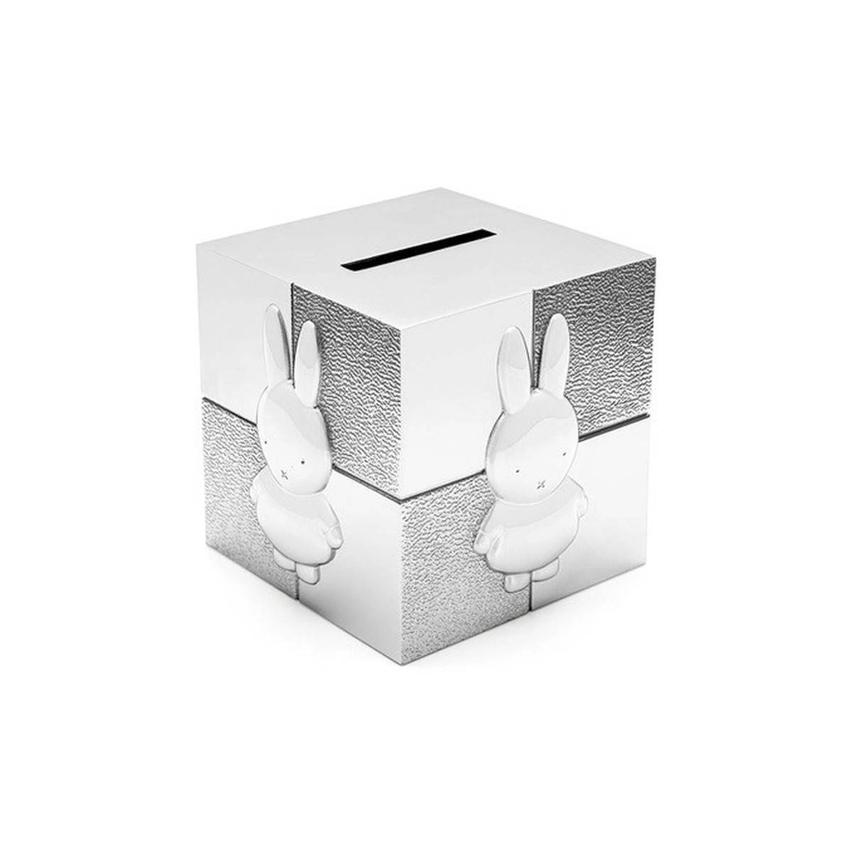 - Stylová pokladnička ve tvaru stříbrné kostky s motivem Miffy.